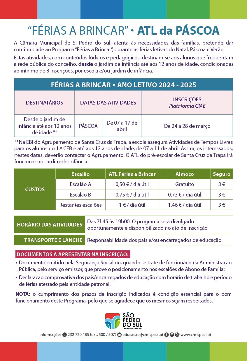 O ATL "Férias a Brincar", com conteúdos lúdicos e pedagógicos, decorre de 7 a 17 de abril, e destina-se aos alunos que frequentam os jardins-de-infância, escolas do 1.º Ciclo do Ensino Básico da rede pública e crianças até aos 12 anos do concelho.